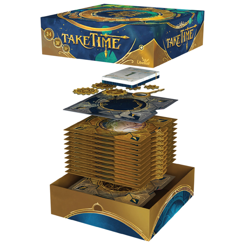 Take Time es un juego cooperativo en el que los participantes deben colaborar para superar diversas pruebas, por lo que la victoria o la derrota serán colectivas. Para ganar, debéis jugar de manera estratégica 12 cartas bocabajo alrededor de un reloj, siguiendo las reglas especiales que se aplican en cada prueba. El juego incluye 40 pruebas que irán aumentando de dificultad y añadiendo reglas nuevas. ¿Podréis superarlas todas?¡Tomaos un tiempo para disfrutar de este maravilloso viaje de principio a fin!